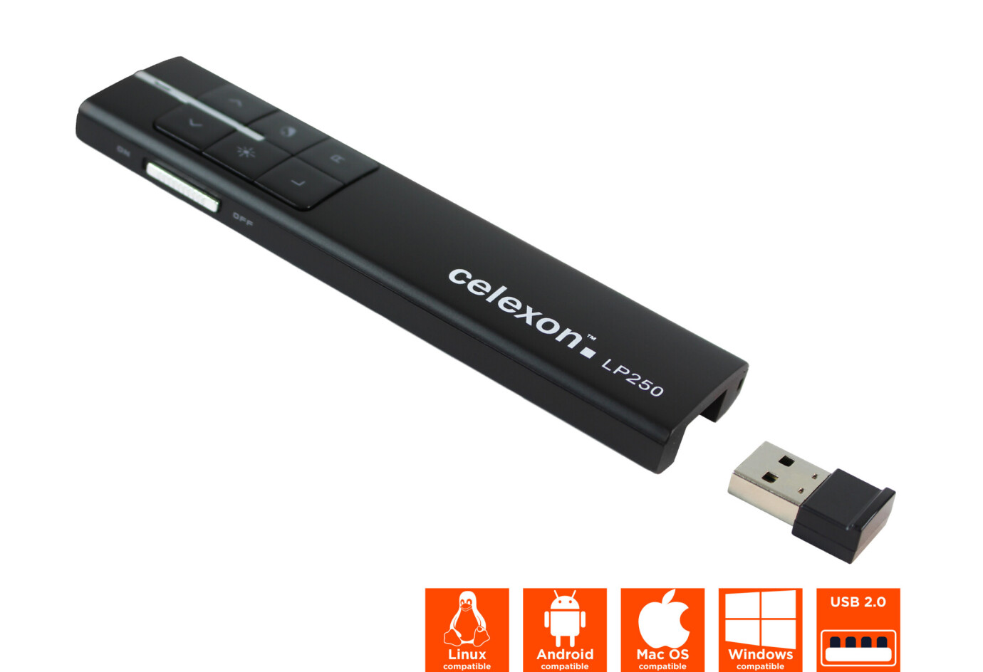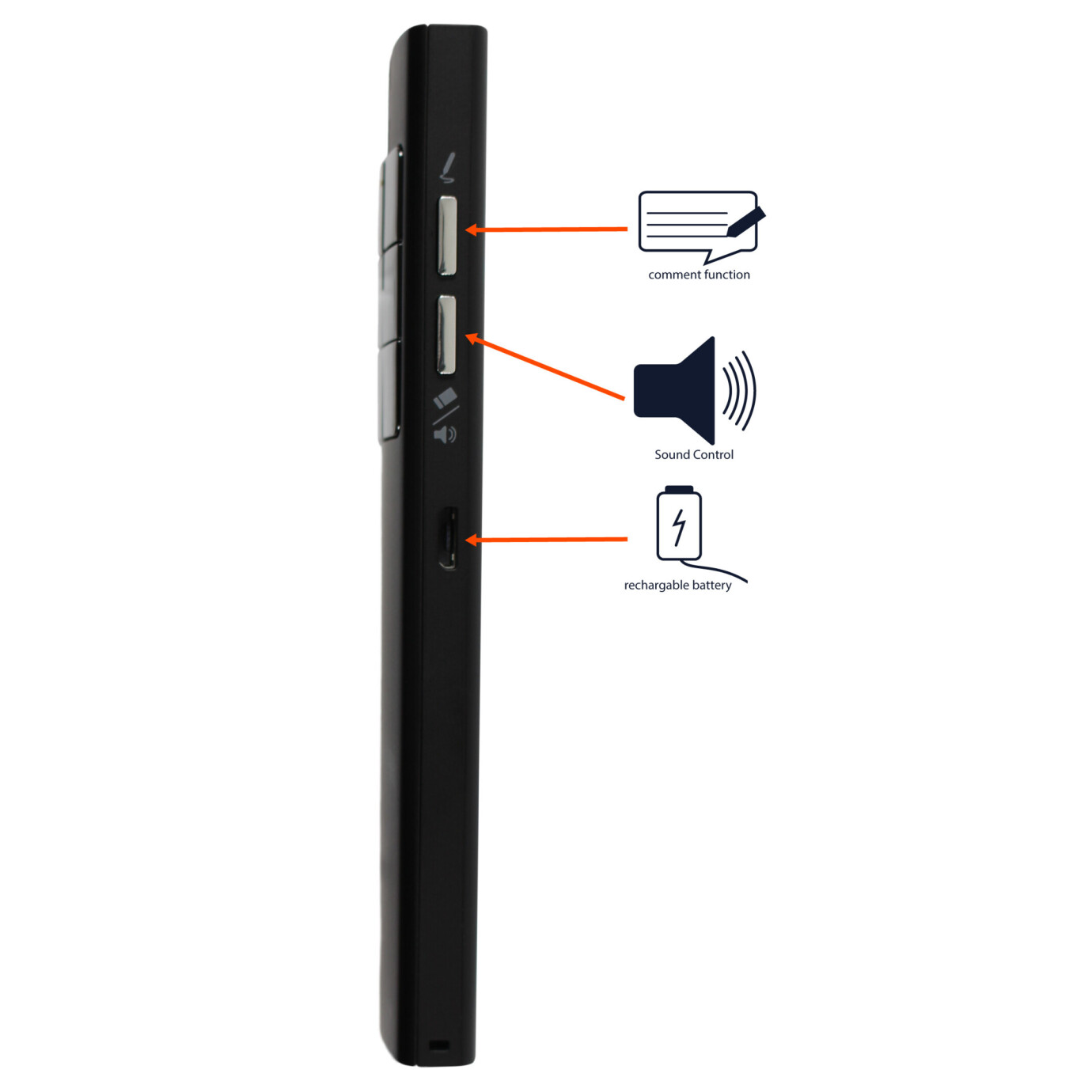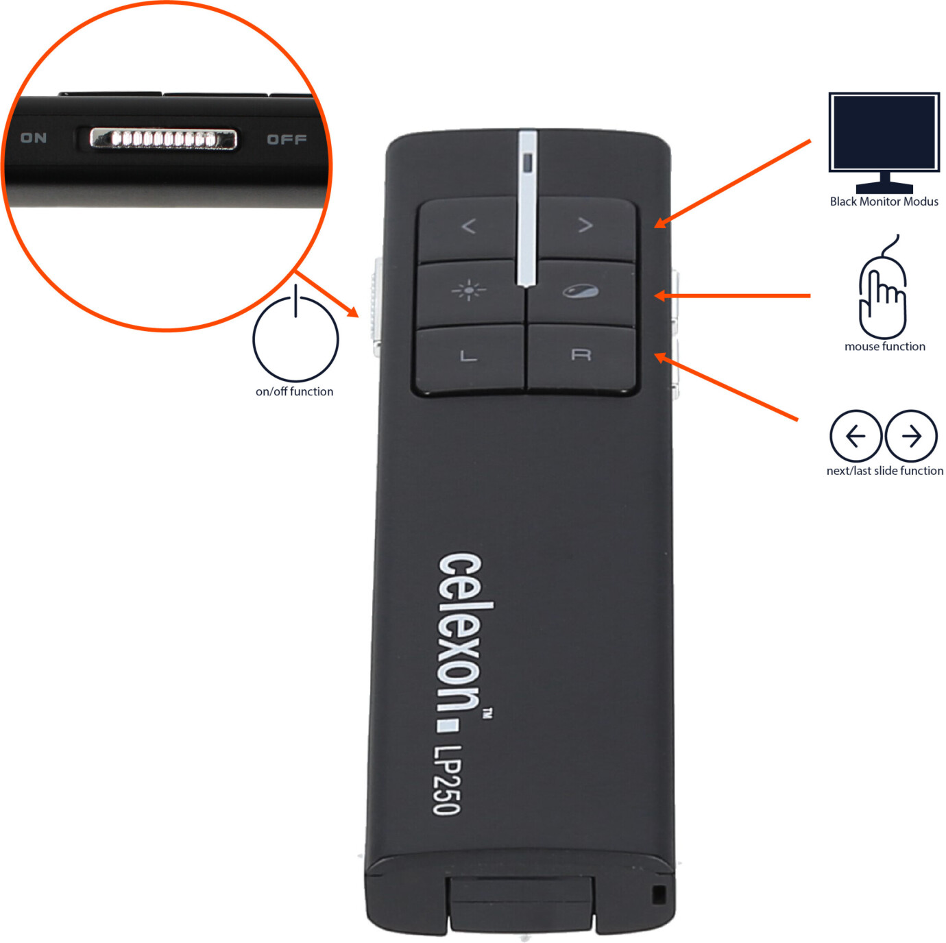 The multi-functionality of the Expert LP250 makes it much easier to display your presentation. With the push of a button, functions such as slide changing, full screen mode, black screen and volume control can be easily achieved. When moving the presenter, the mouse can be moved to your screen, a left and right click can be executed using the corresponding buttons on the LP250. In combination with the mouse function and an additional push of a button, you can visually comment on the content of your presentation.